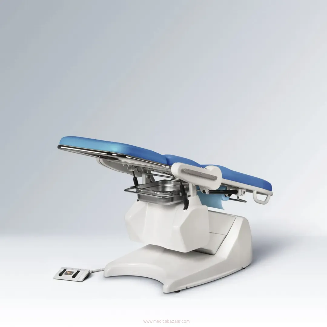 The electrically controlled height adjustment helps save time and reduces needed effort of the staff. The adjustment is performed using a foot controller. The other adjustments are performed using gas springs with locking mechanism.