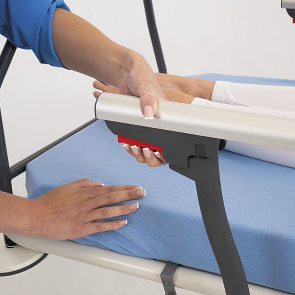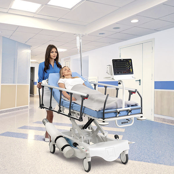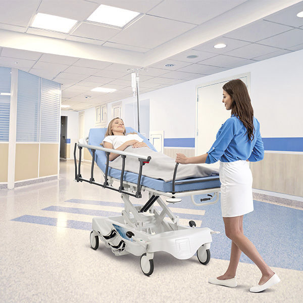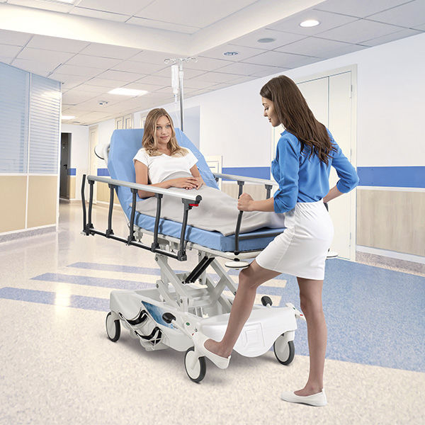Zero gap transfer between the bed and the stretcher when moving the patient - minimizes the strain on hospital staff and reduces the risk of falls. The siderails lower not only below the mattress, but also below the stretcher pallet. There are as many as two pairs of handles to guide the stretcher through hospital corridors. The directional wheel and the optional 5th wheel make maneuvering extremely easy, even with heavy patients.