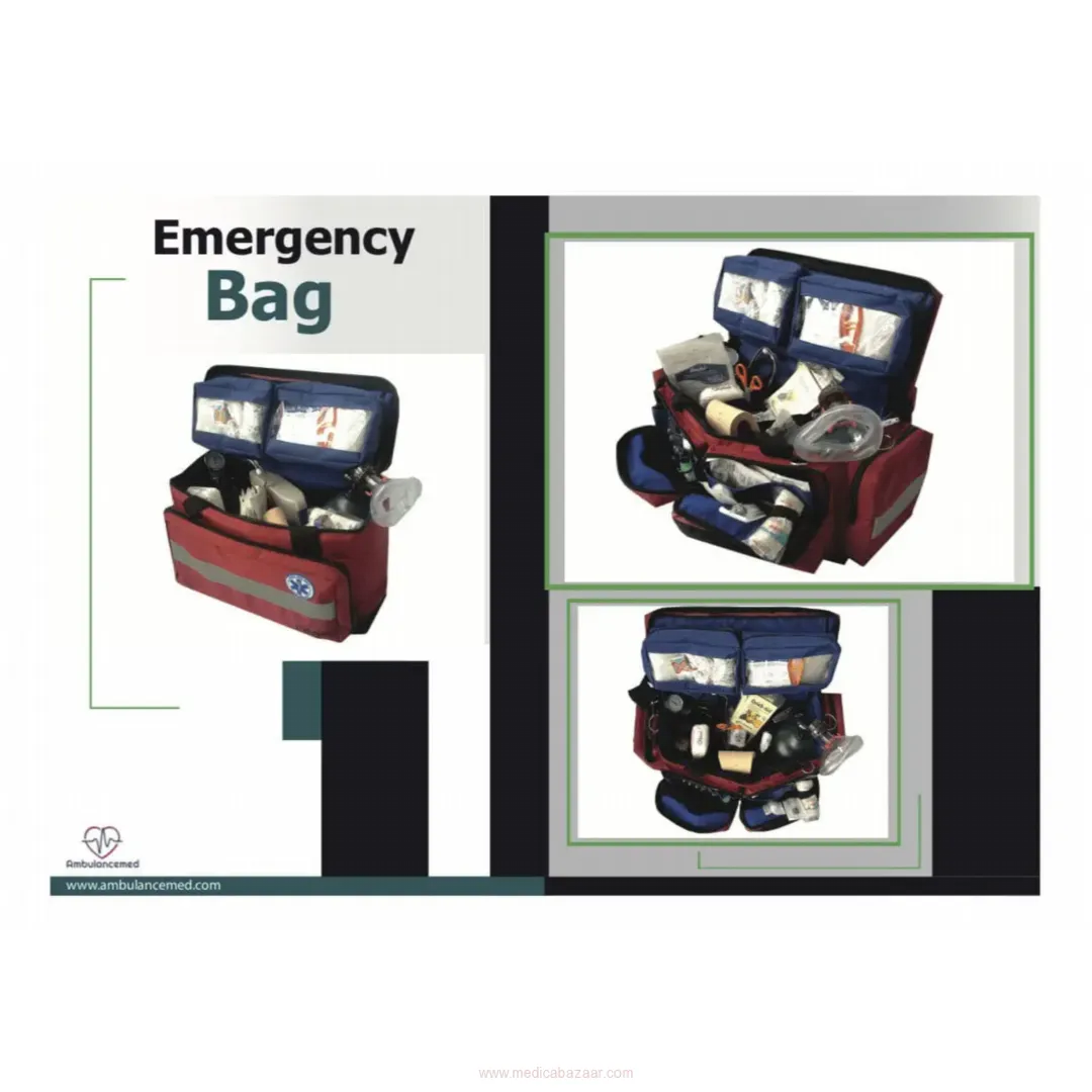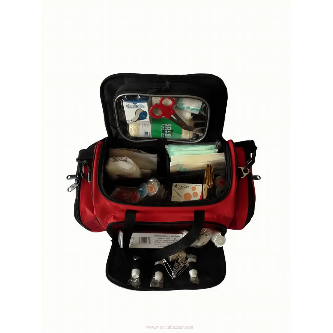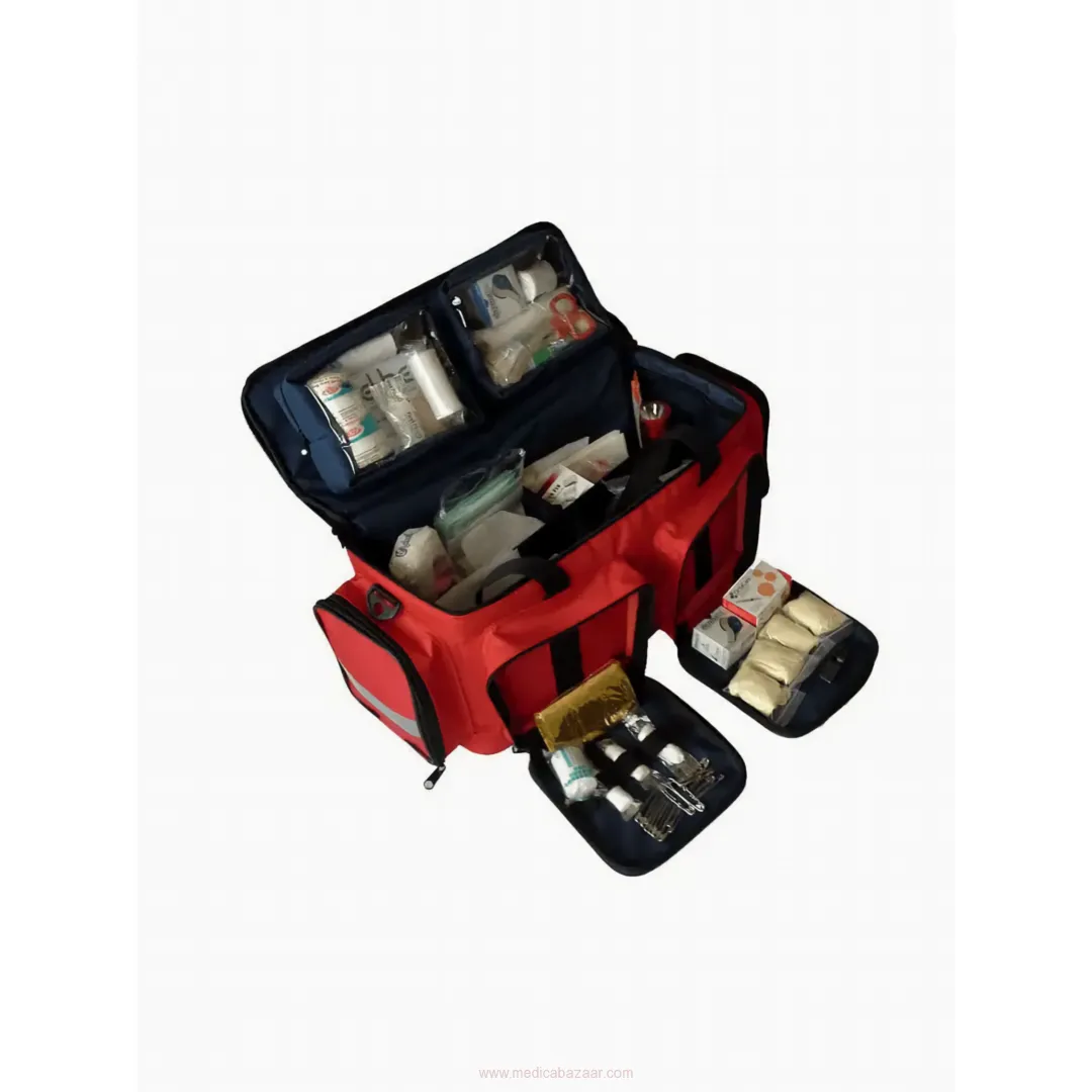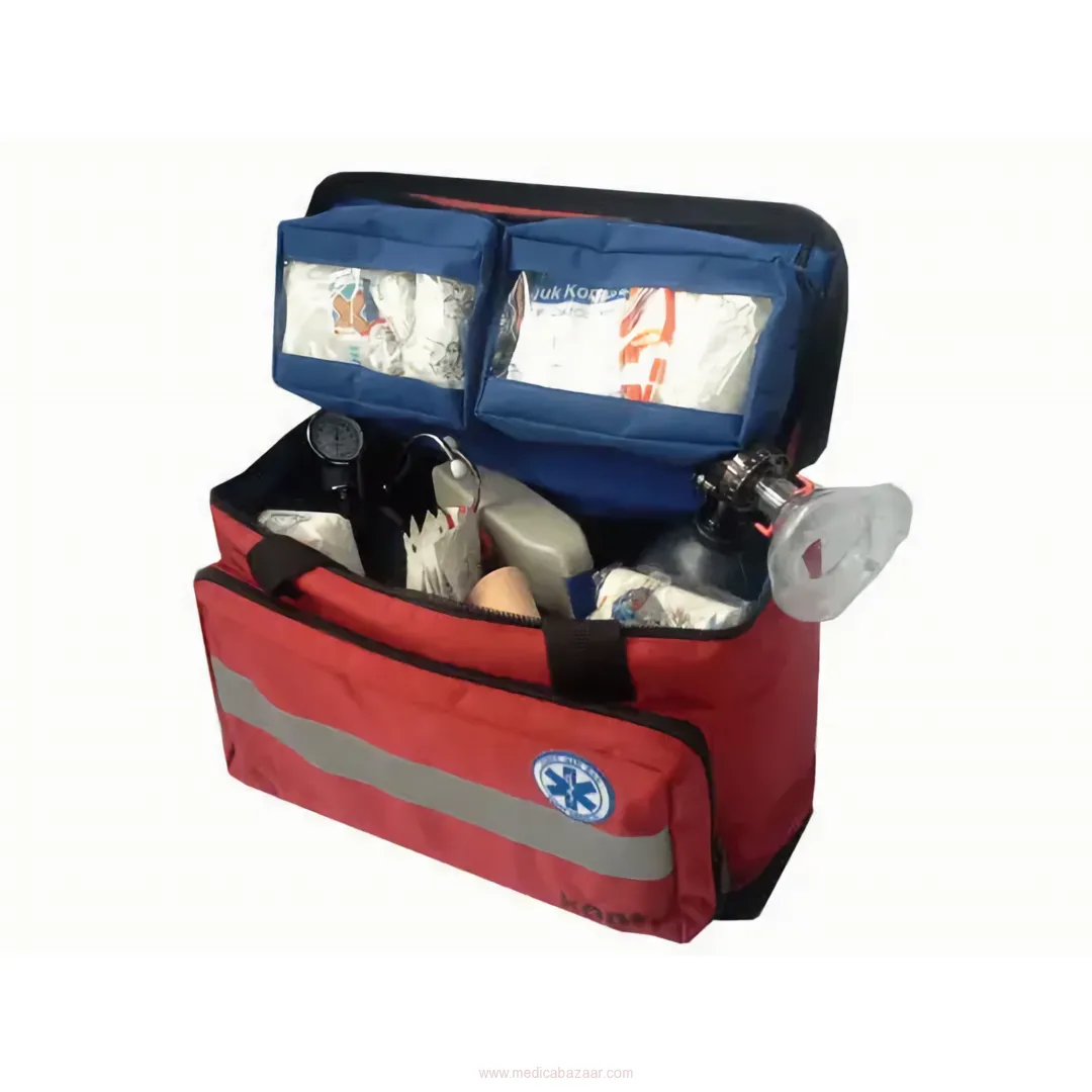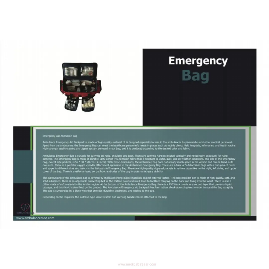 Ambulance Emergency Bag is suitable for carrying on hand, shoulder, and back. There are carrying handles located vertically and horizontally, especially for hand carrying. The Emergency Bag is made of durable 1100 denier PVC tarpaulin fabric that is resistant to water, dust, and all weather conditions. The size of the Emergency Bag, except side pockets, is 55 * 40 * 20 cm. (± 3 cm). With these dimensions, the ambulance bag does not occupy much space in the vehicle and can be fixed in its own area. There is a portable oxygen cylinder attachment apparatus in the Ambulance Emergency Bag. There are a total of 5 detachable bags with a transparent cover and zipper in different sizes and colors in the Ambulance Emergency Bag.