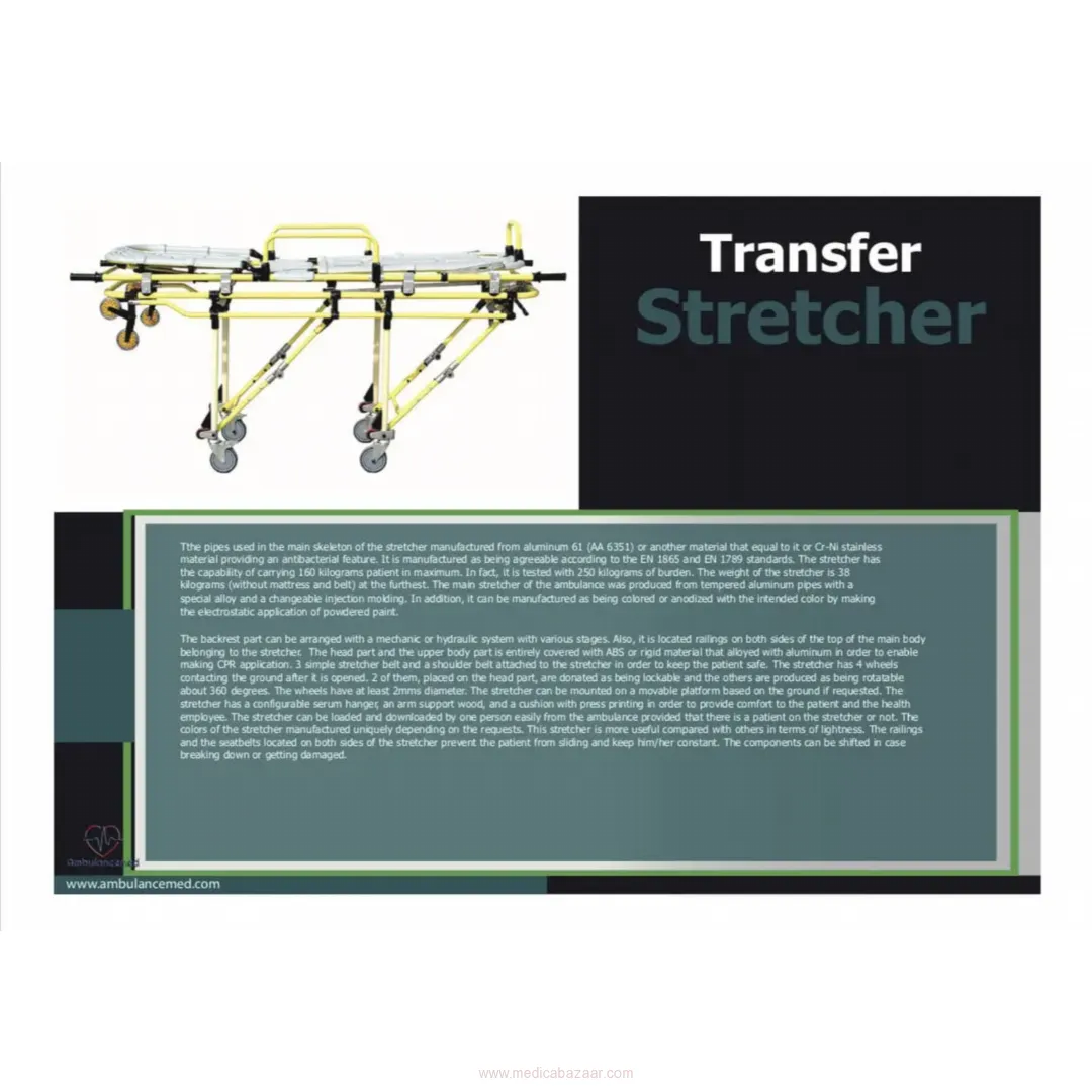 The main stretcher of the ambulance was produced from tempered aluminum pipes with a special alloy and a changeable injection molding. In addition, it can be manufactured as being colored or anodized with the intended color by making the electrostatic application of powdered paint. The backrest part can be arranged with a mechanic or hydraulic system with various stages. Also, it is located railings on both sides of the top of the main body belonging to the stretcher.