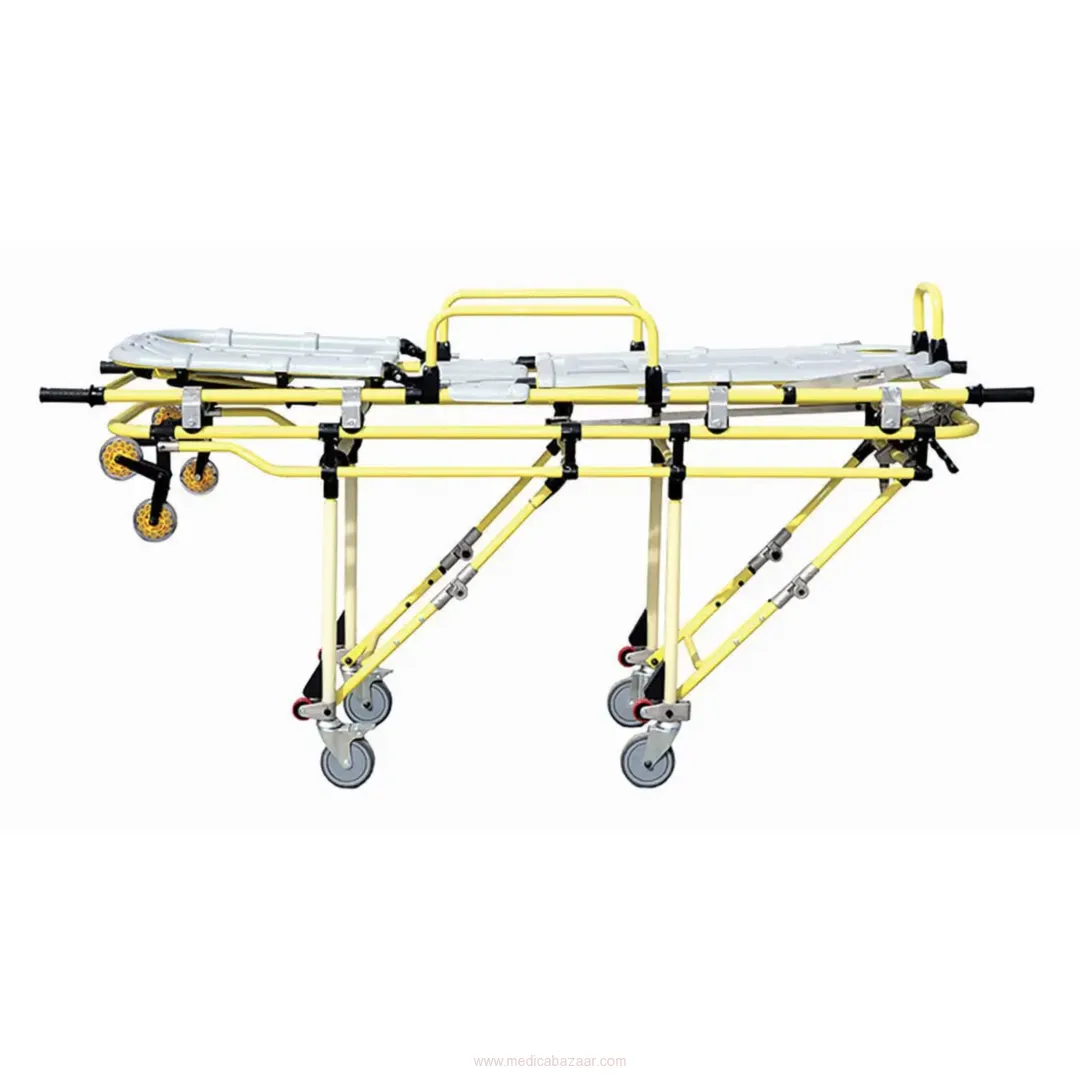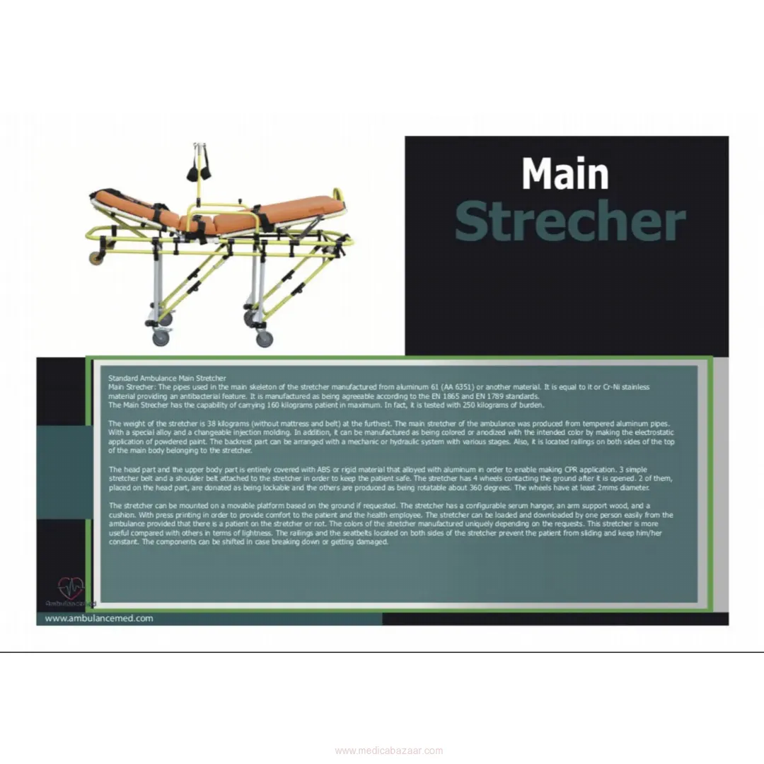 The weight of the stretcher is 38 kilograms (without mattress and belt) at furthest. The main stretcher of the ambulance was produced from tempered aluminum pipes. With a special alloy and a changeable injection molding. In addition, it can be manufactured as being colored or anodized with intended color by making electrostatic application of powdered paint. The backrest part can be arranged with a mechanic or hydraulic system with various stages. Also, it is located railings on both sides of the top of the main body belonging to the stretcher.