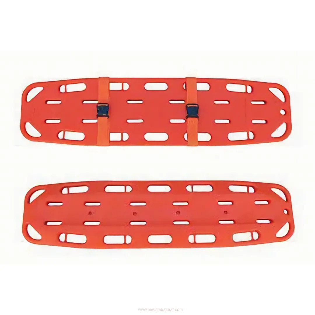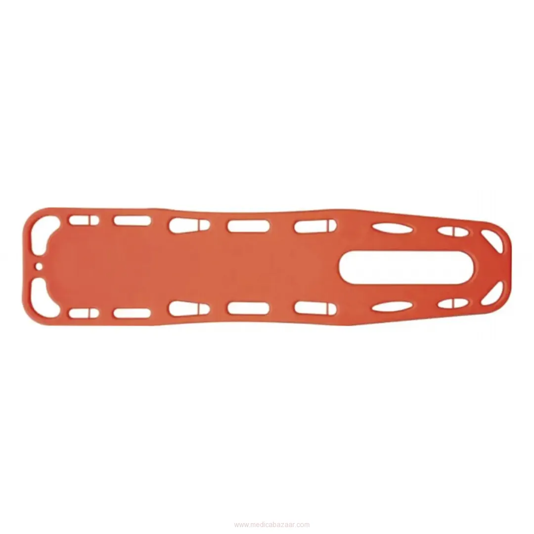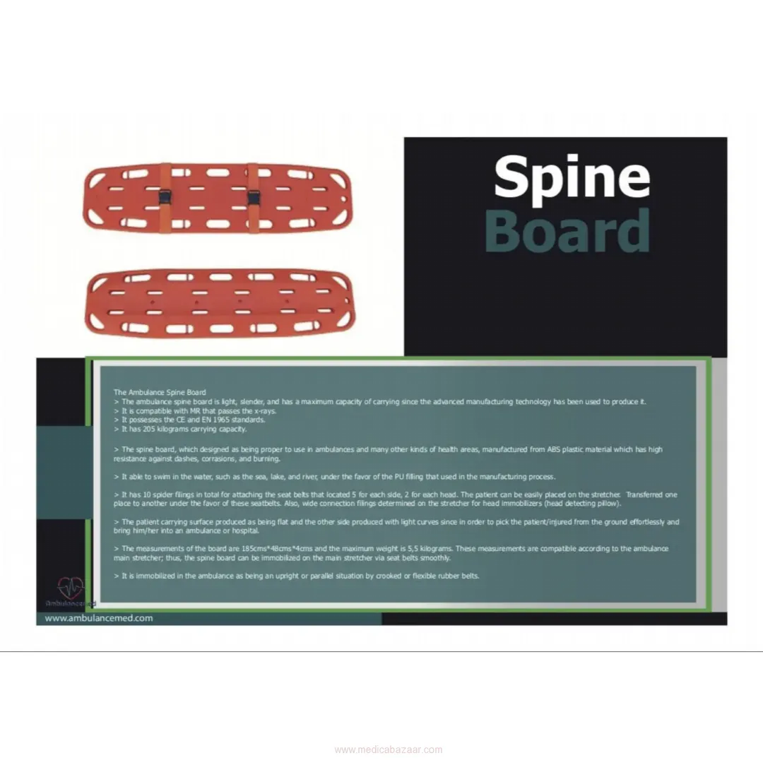 The spine board, which designed as being proper to use in ambulances and many other kinds of health areas, manufactured from ABS plastic material which has high resistance against dashes, corrasions, and burning.