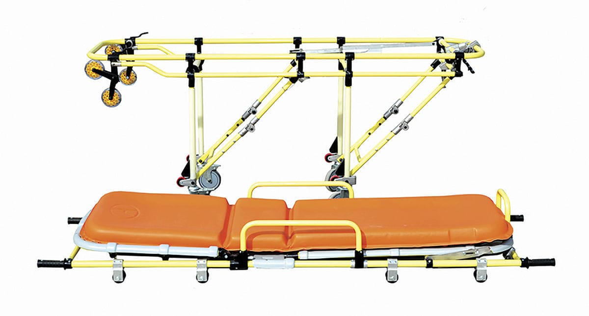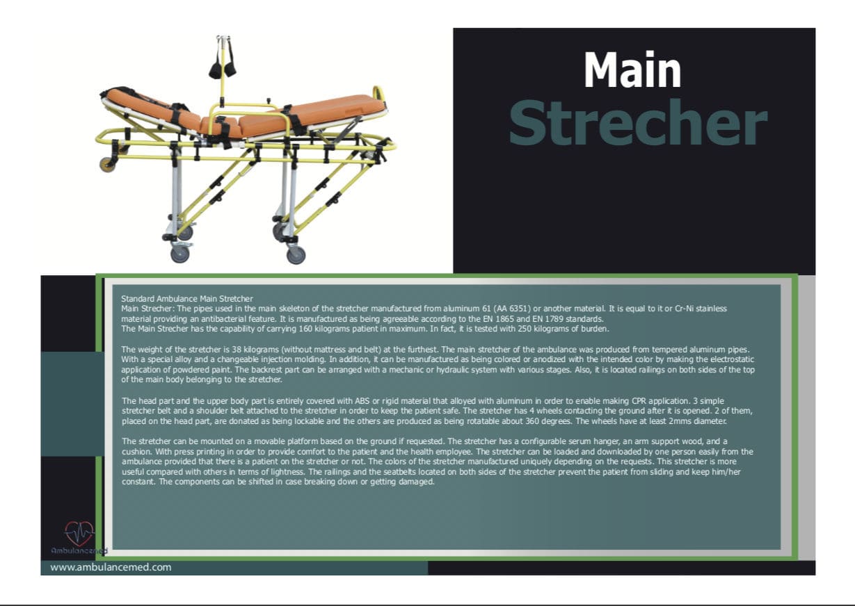 The weight of the stretcher is 38 kilograms (without mattress and belt) at furthest. The main stretcher of the ambulance was produced from tempered aluminum pipes. With a special alloy and a changeable injection molding. In addition, it can be manufactured as being colored or anodized with intended color by making electrostatic application of powdered paint. The backrest part can be arranged with a mechanic or hydraulic system with various stages. Also, it is located railings on both sides of the top of the main body belonging to the stretcher.
