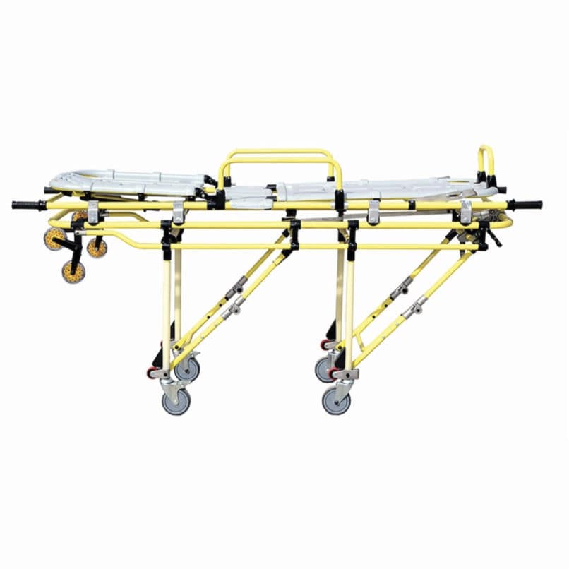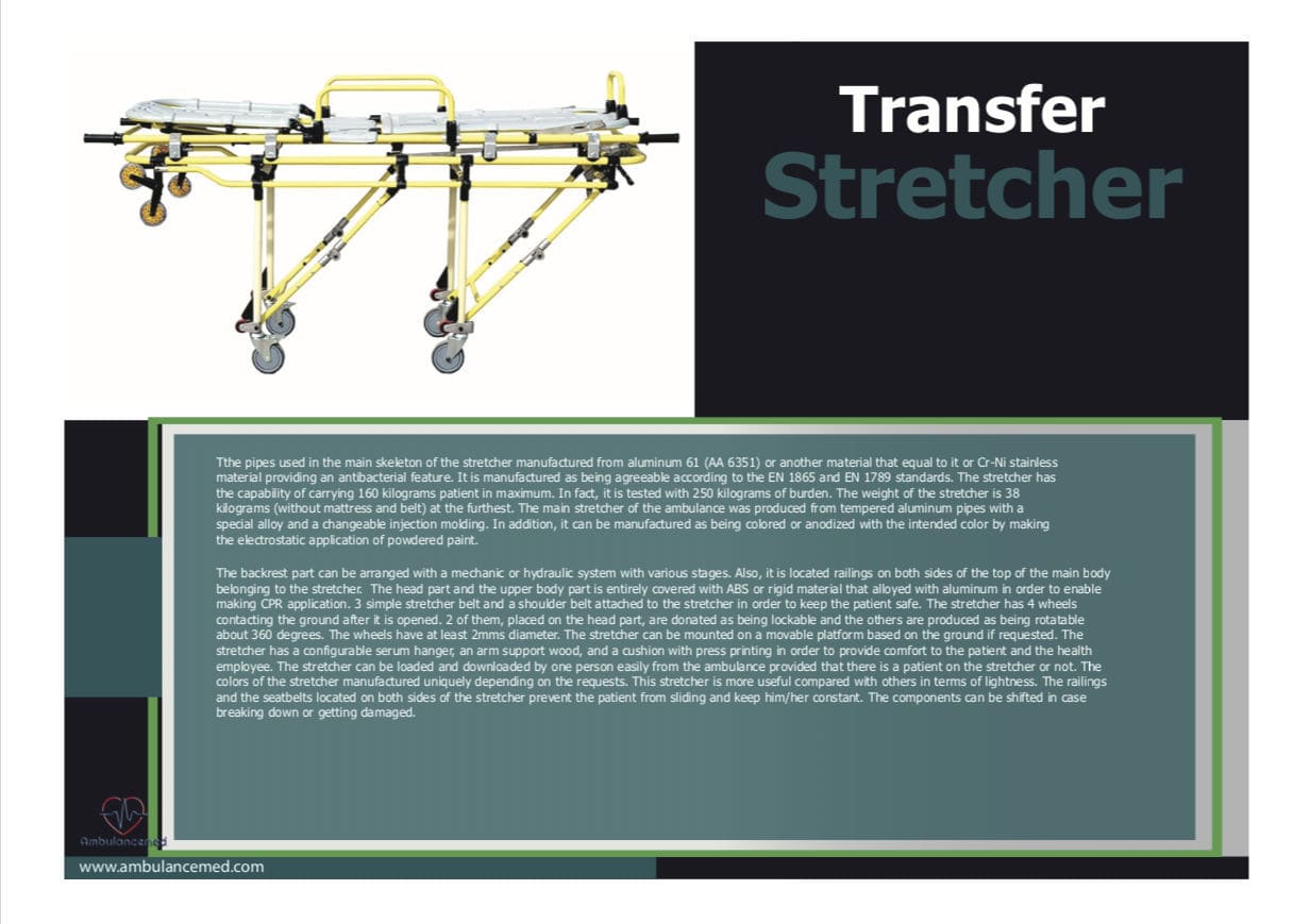 The main stretcher of the ambulance was produced from tempered aluminum pipes with a special alloy and a changeable injection molding. In addition, it can be manufactured as being colored or anodized with the intended color by making the electrostatic application of powdered paint. The backrest part can be arranged with a mechanic or hydraulic system with various stages. Also, it is located railings on both sides of the top of the main body belonging to the stretcher.