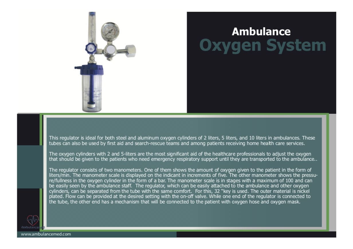 The regulator consists of two manometers. One of them shows the amount of oxygen given to the patient in the form of liters/min. The manometer scale is displayed on the indicant in increments of five. The other manometer shows the pressure/fullness in the oxygen cylinder in the form of a bar. The manometer scale is in stages with a maximum of 100 and can be easily seen by the ambulance staff. The regulator, which can be easily attached to the ambulance and other oxygen cylinders, can be separated from the tube with the same comfort. For this, 32 “key is used. The outer material is nickel plated. Flow can be provided at the desired setting with the on-off valve. While one end of the regulator is connected to the tube, the other end has a mechanism that will be connected to the patient with oxygen hose and oxygen mask.