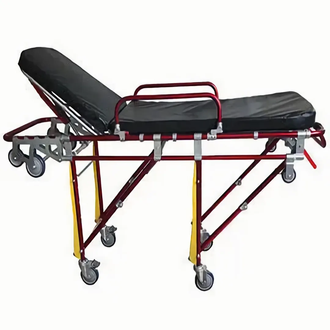 The mechanical fold-away legs are controlled by the handles on the both ends of the stretcher. The legs can be folded under the stretcher automatically when loading into the vehicle. This stretcher can be locked by a fixing device when in the ambulance.