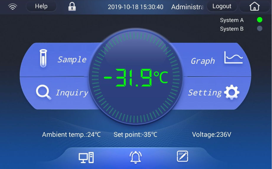 The dual refrigeration systems run independently and alternately, both reaching -80ºC, such that if one system fails the other will maintain temperature to ensure sample storage safety.