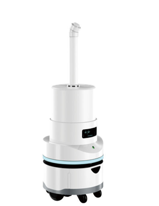 multi-point disinfection tasks. This is achieved by diluting th e disinfectant to form tiny particles (mist), which can effectively kill microorganisms, bacteria, and viruses attached to the surface of an object. A ccording to the actual disinfection needs of the location, it can autonomously plan the disinfection route, and is a fully automated mobile indoor unmanned disinfection carrier. The unit can sterilize 360°within the indoor environment and can disinfect 1000m3 areas in 15 minutes, reducing manual contact and avoiding the risk of personnel infection.