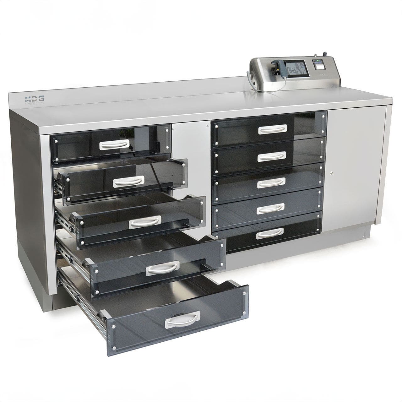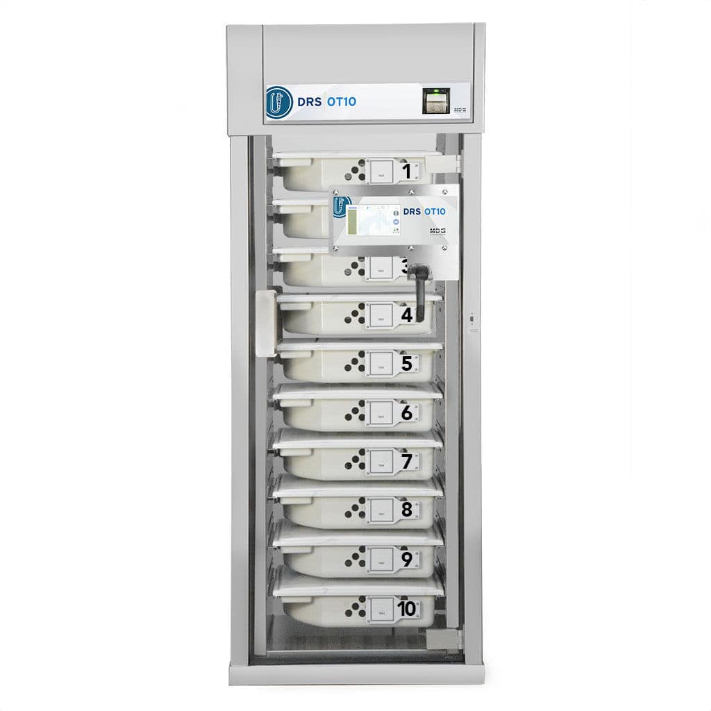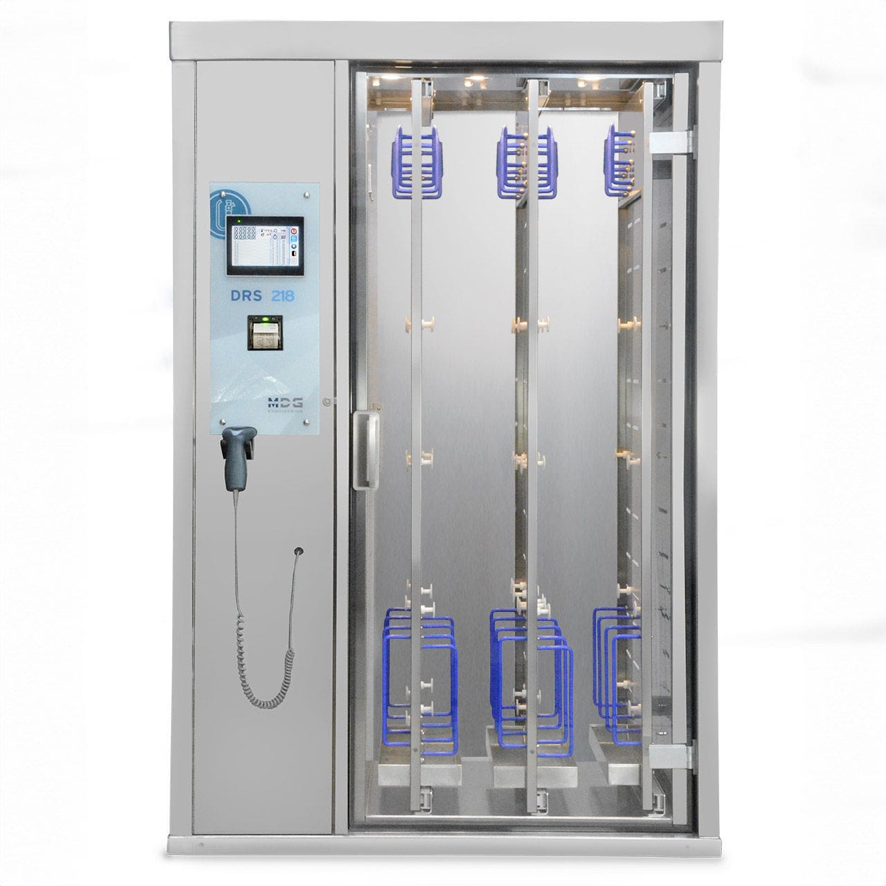 DRS-218/S/VP is a cabinet in horizontal storage, to store and dry endoscopes and TEE probes. It allows the aseptic storage, up to 800 hours, up to 10 flexible endoscopes of any brand and model. As class I medical devices, it is designed to grant complete conformity to EN 16442:2015, maintaining, in each condition, the correct pressure of sterile air inside the storage drawers, avoiding the risk of environmental contaminations.
