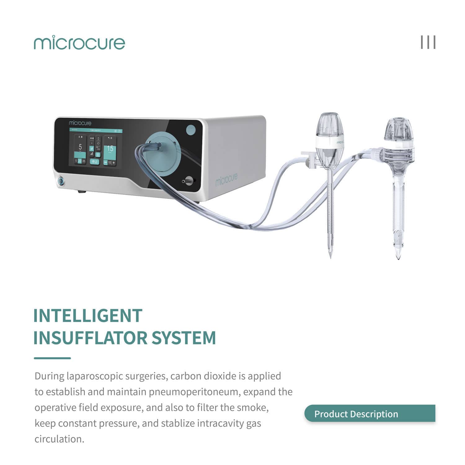 The Intelligent Insufflator is a device used for creating and maintaining pneumoperitoneum during abdominal endoscopic surgery. The insufflator can be used to infuse medical CO2 gas into the abdominal cavity, which separates the abdominal wall from intraperitoneal organs, forming a space for surgical operation and surgical field. When the desired pressure is reached, the gas intake can be automatically stopped and a volume of gas can be kept to maintain the abdominal cavity in a desired pressure inflation state.