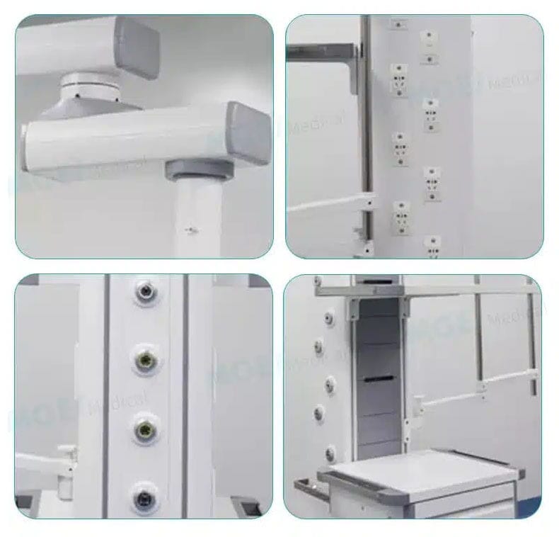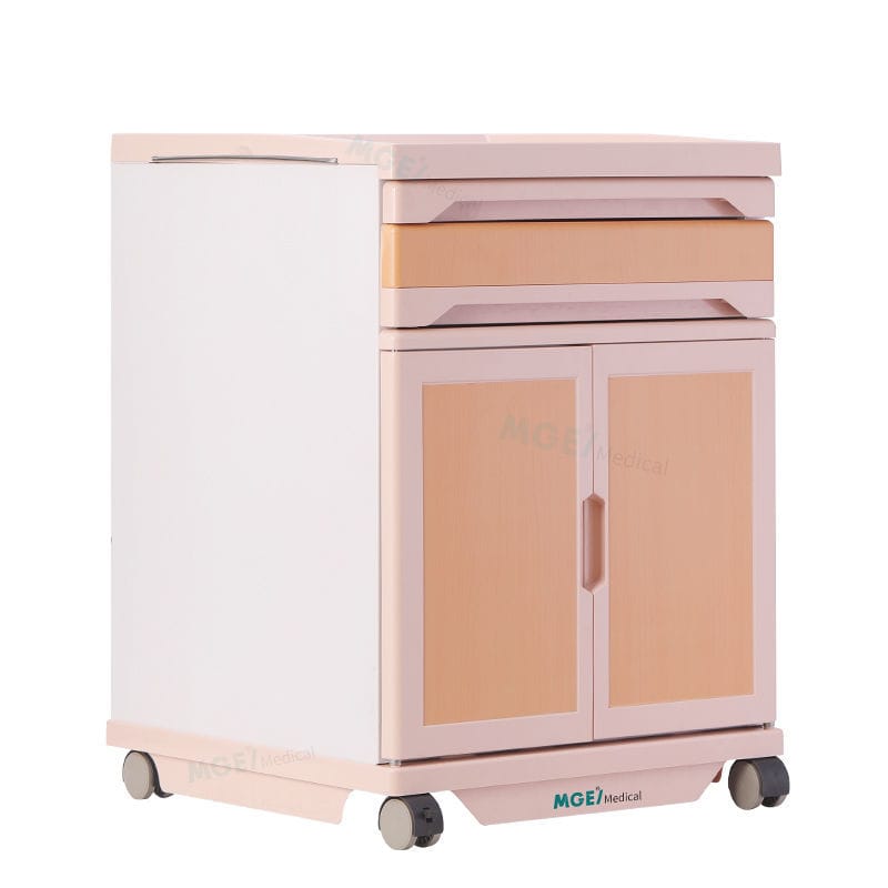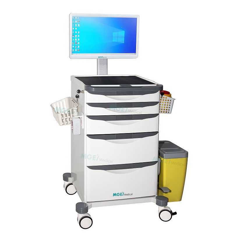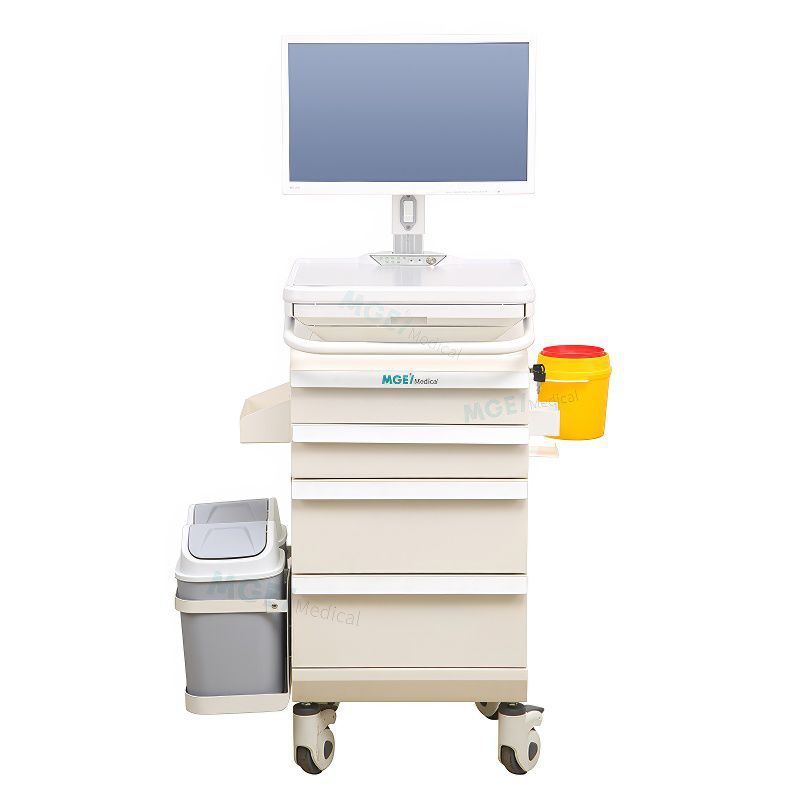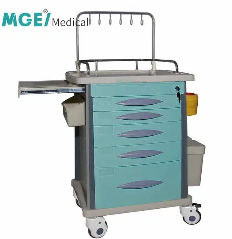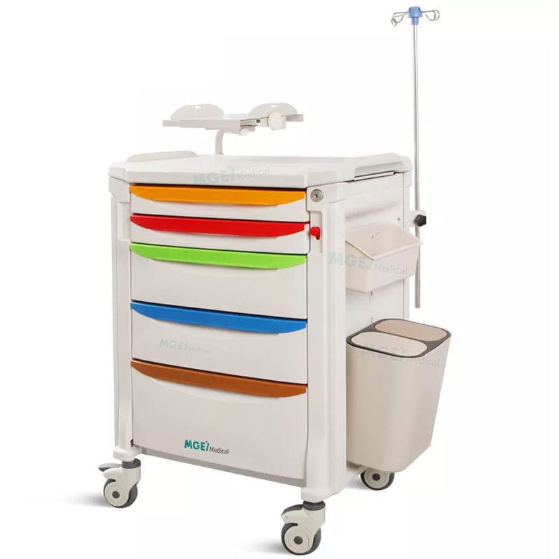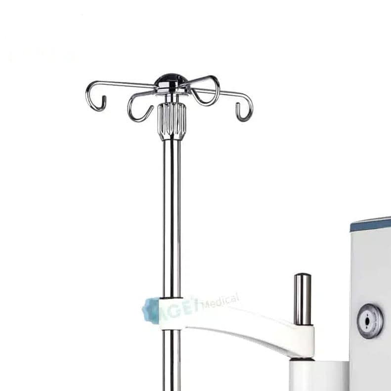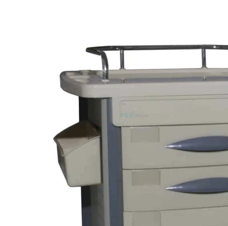Right-Side Features: Retractable IV pole, large rotating sharps container, and dual ABS waste bins for separating medical waste.