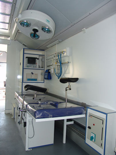 Examination room includes refrigerator, cupboard, examination coach for gynecological purposes, defibrillator, ECG, monitoring instruments, roof lamp for surgical operations