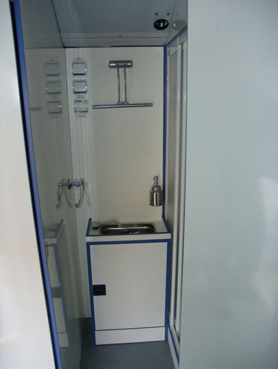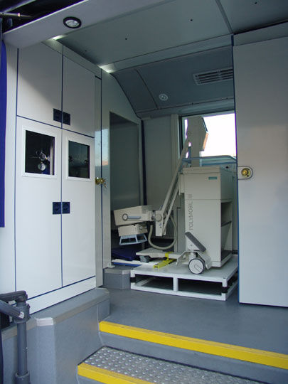 Xray equipment, washbasin, shower cabin, WC are located in the middle of the vehicle.