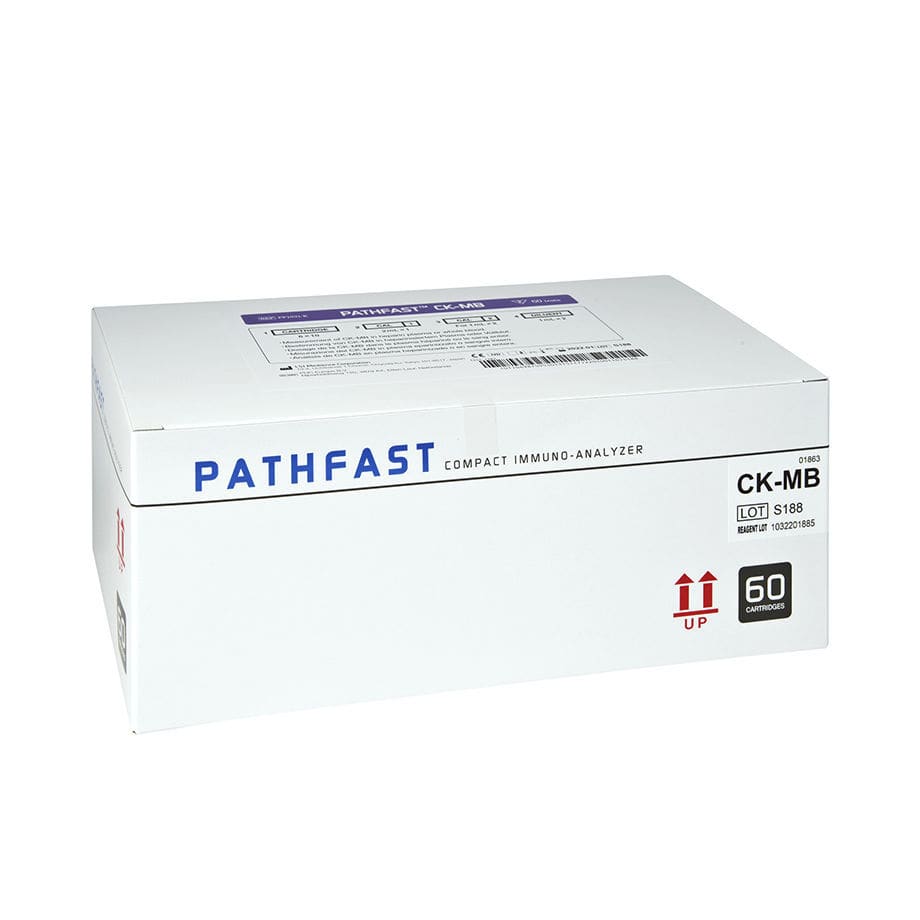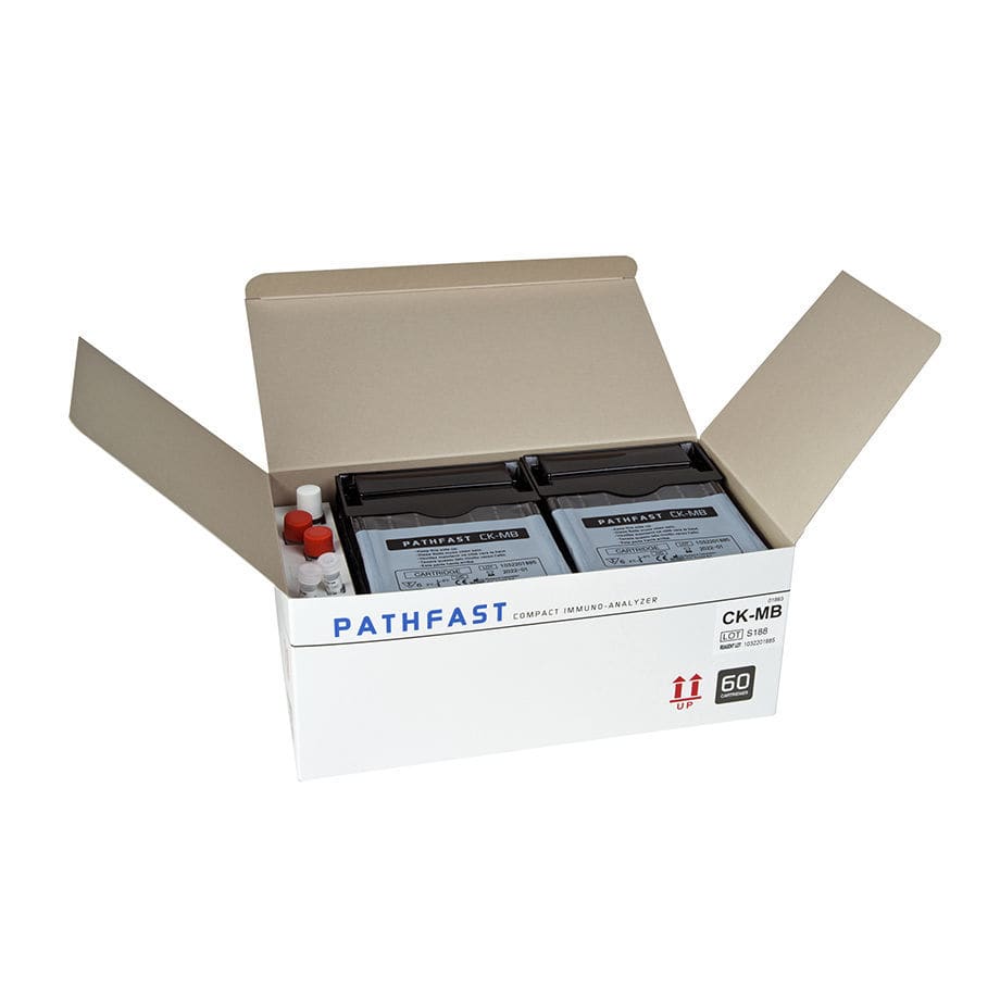 PATHFAST™ CK-MB is a product for in vitro diagnostic use with the in vitro diagnostic system PATHFAST™ for the quantitative measurement of CK-MB in heparinized whole blood and plasma. The result obtained with the assay is used to assist in the diagnosis of acute myocardial infarction. Creatine kinase (CK) is a key enzyme of energy metabolism in muscle that catalyzes the reversible phosphorylation of creatine. This dimeric enzyme has two subunits, M and B, which associate to form three isoenzymes, CK-MM, CK-MB and CK-BB. CK-MM and CK-BB are distributed primarily in the skeletal muscle and in the brain, respectively. CK-MB is found predominantly in cardiac muscle accounting for approximately 10 – 40% of myocardial CK. Damage to the myocardium results in a transient and progressive release of CK-MB into the circulation. The CK-MB concentration increases at 2.5- 5 hours after onset of chest pain reaching a peak at 12 to 24 hours and then returning to normal levels within 48 to 72 hours. This characteristic temporal pattern is diagnostic for AMI. The low concentration of CK-MB in serum of healthy subjects and non-cardiac tissues contributes to its widely accepted use as an aid for diagnosing and monitoring of myocardial injury.