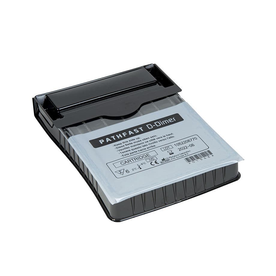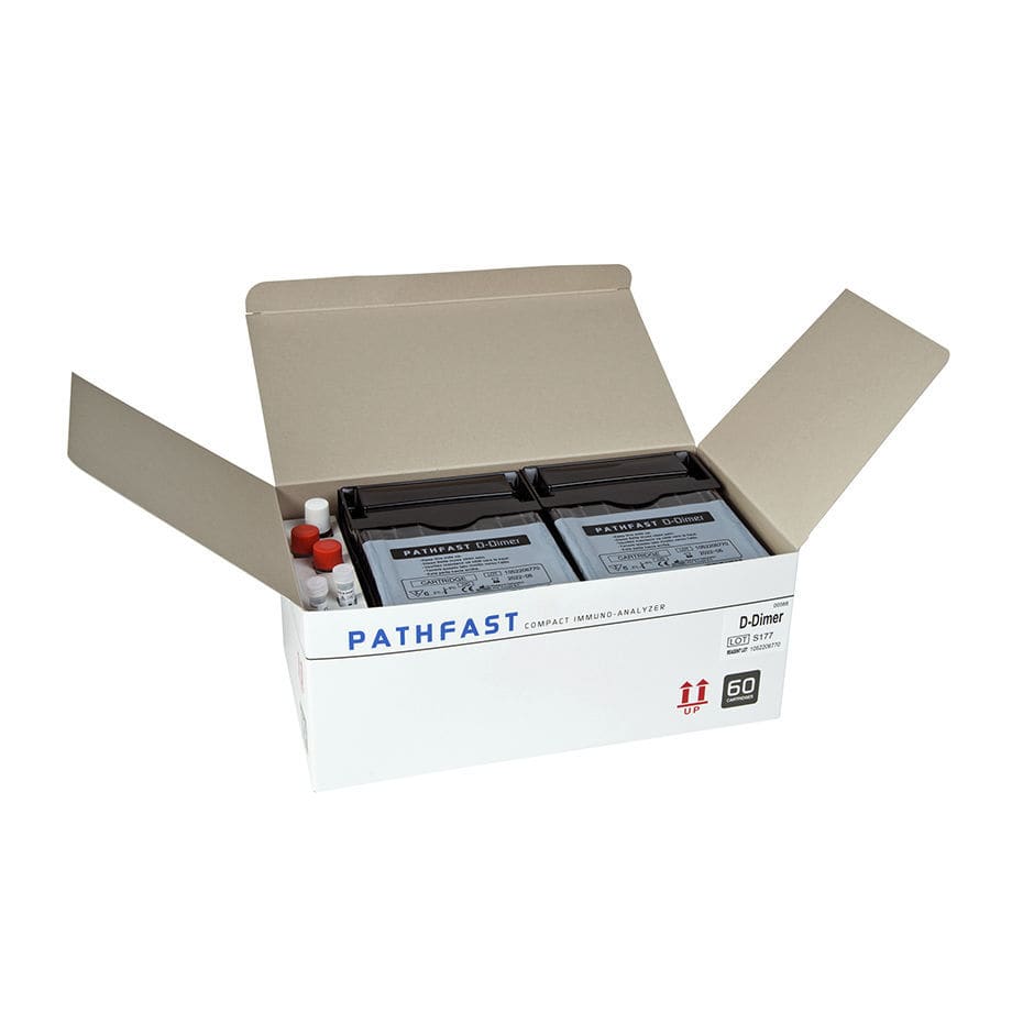 PATHFAST™ D-Dimer is a chemiluminescent enzyme immunoassay for the quantitative measurement of D-Dimer concentration in whole blood or plasma. PATHFAST™ D-Dimer is used an aid in the diagnosis of activation processes of the coagulation system including deep vein thrombosis (DVT) and pulmonary embolism (PE). Plasmin-induced lysis of crosslinked fibrin results in the formation of D-dimer containing fibrin degradation fragments (XDP). D-dimer is a specific marker of the degradation of factor XIIIa- crosslinked fibrin and an indirect early marker of activation of coagulation and clot formation. The plasma concentration of D-dimer is elevated in clinical conditions associated with activation processes of the coagulation system including DVT, PE, and DIC. The exclusion of DVT or PE in patients suspicious for venous thromboembolism is possible if the D-dimer concentration is below the cut off value established by numerous clinical studies. D-dimer measurement is also usable as an aid in diagnosis and monitoring of DIC