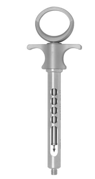 Has a threaded tip, barrel, rod/plunger with a harpoon attached that embeds itself into the rubber stopper of the carpule.